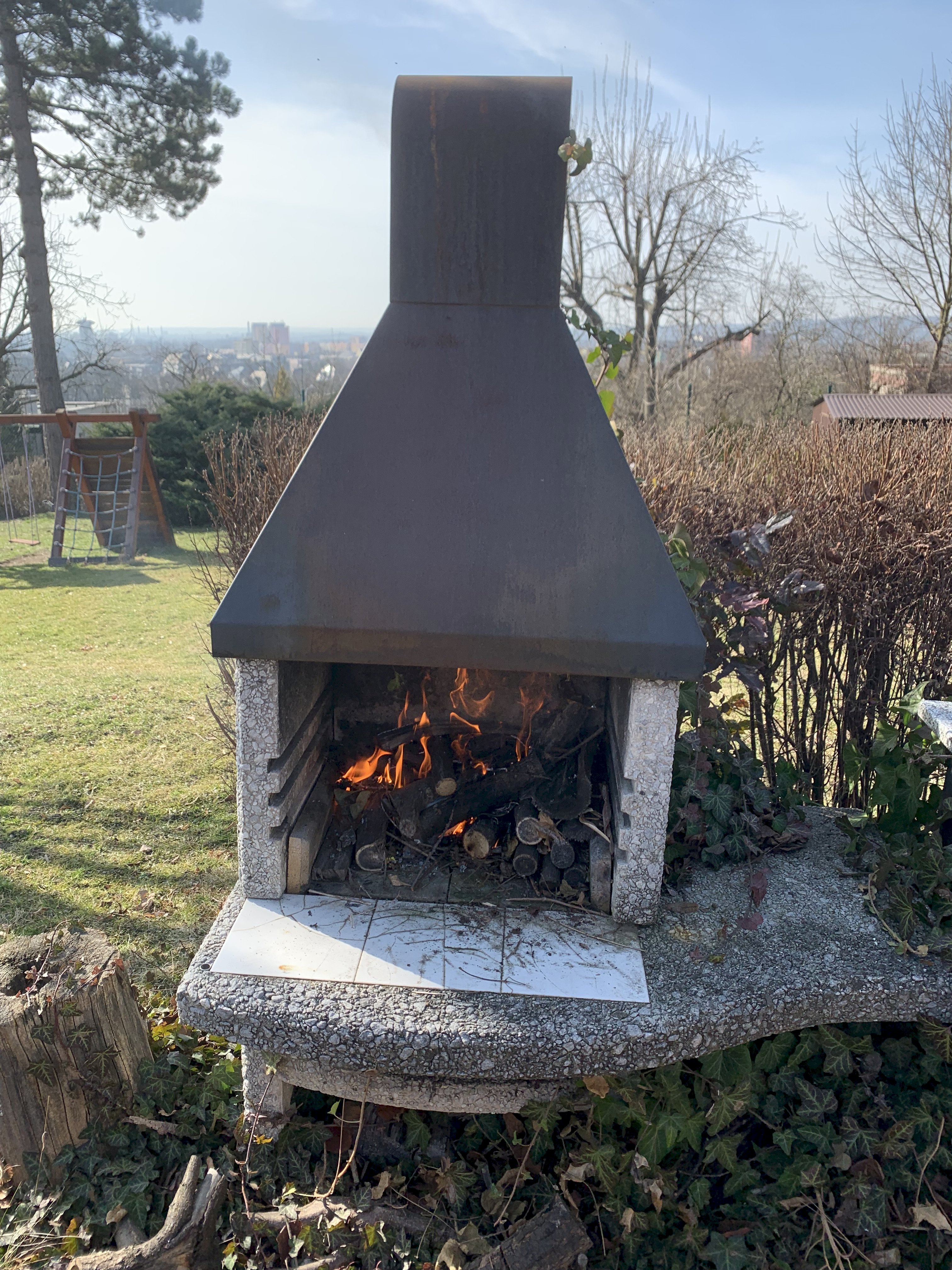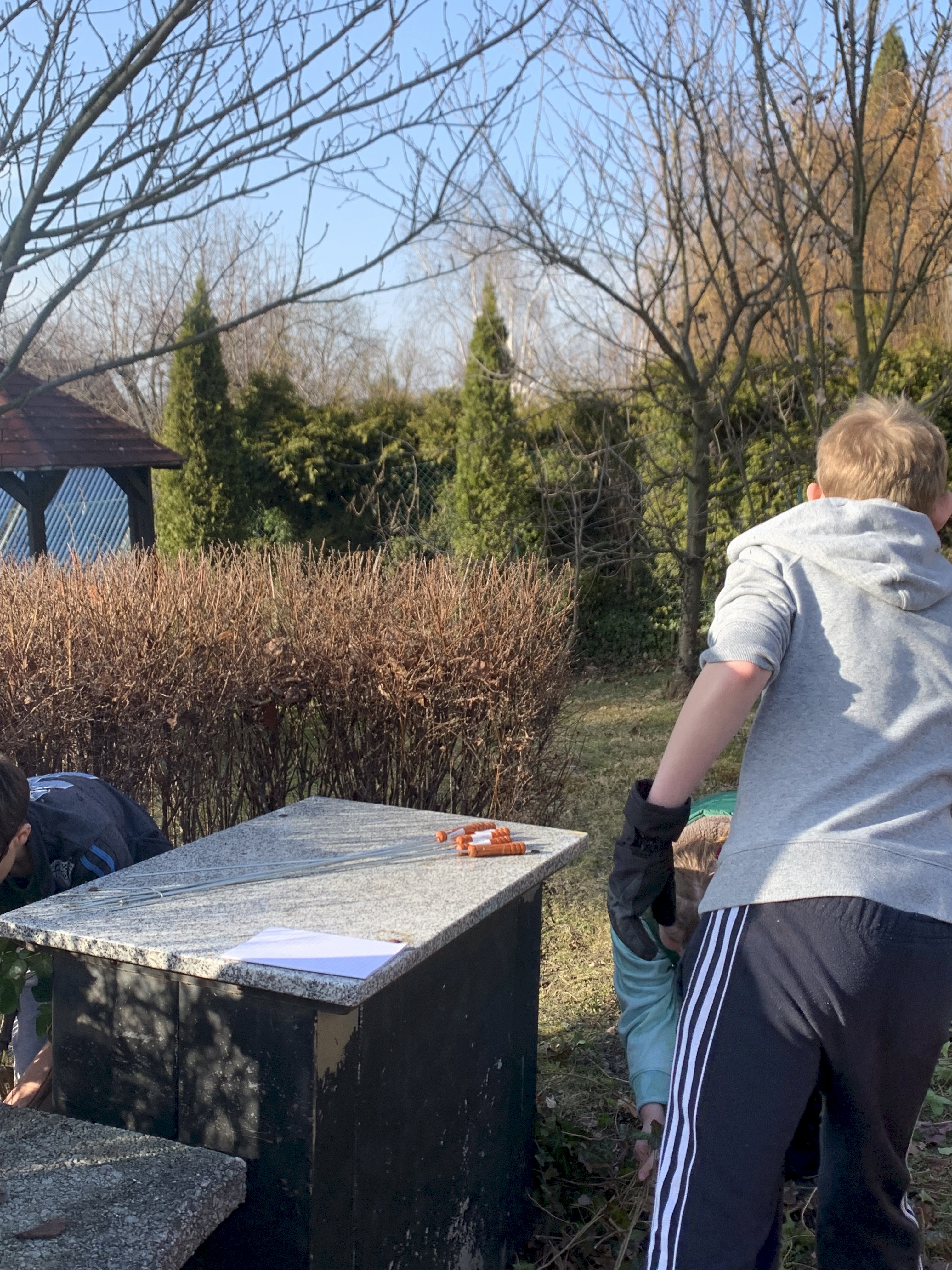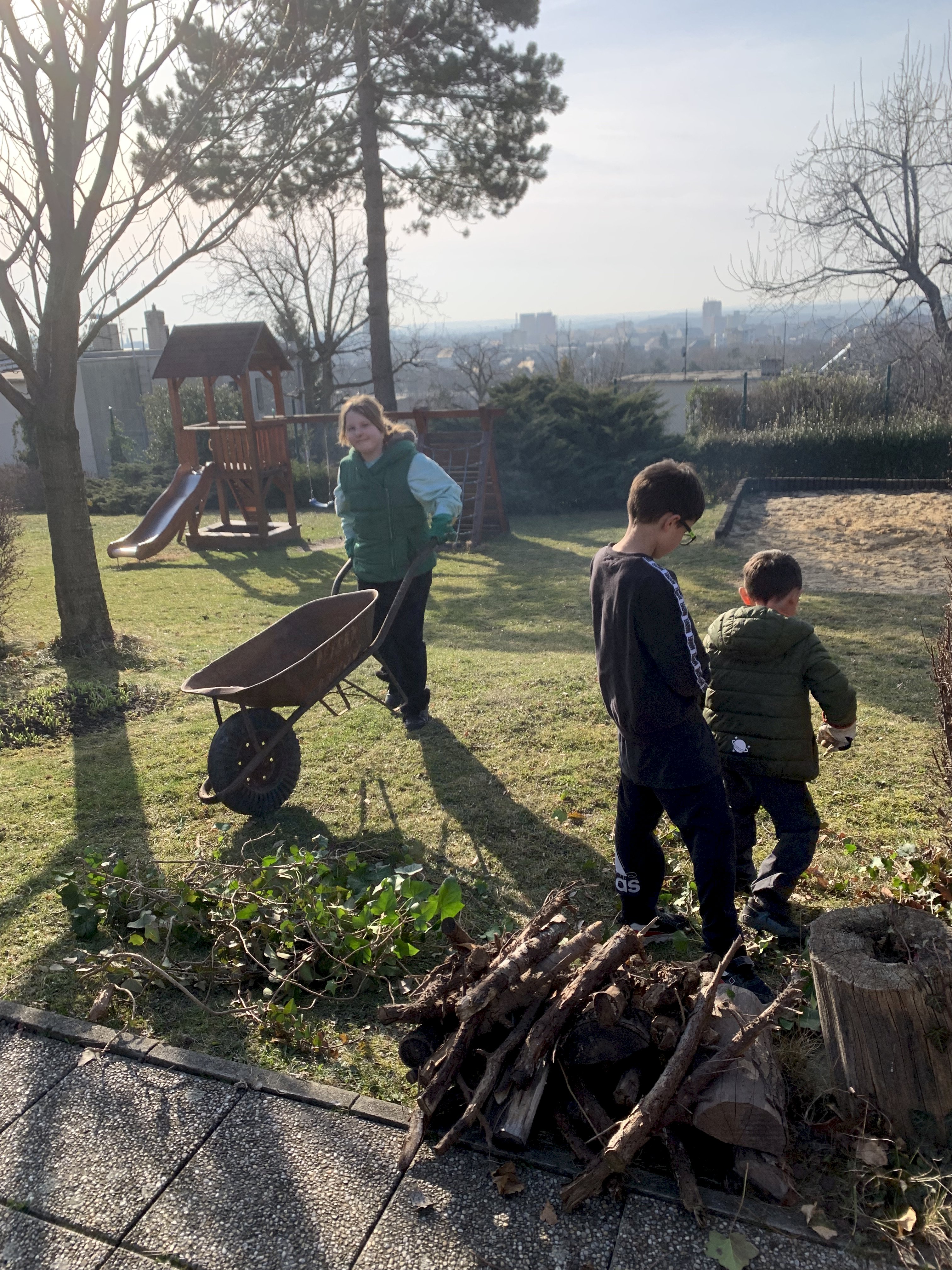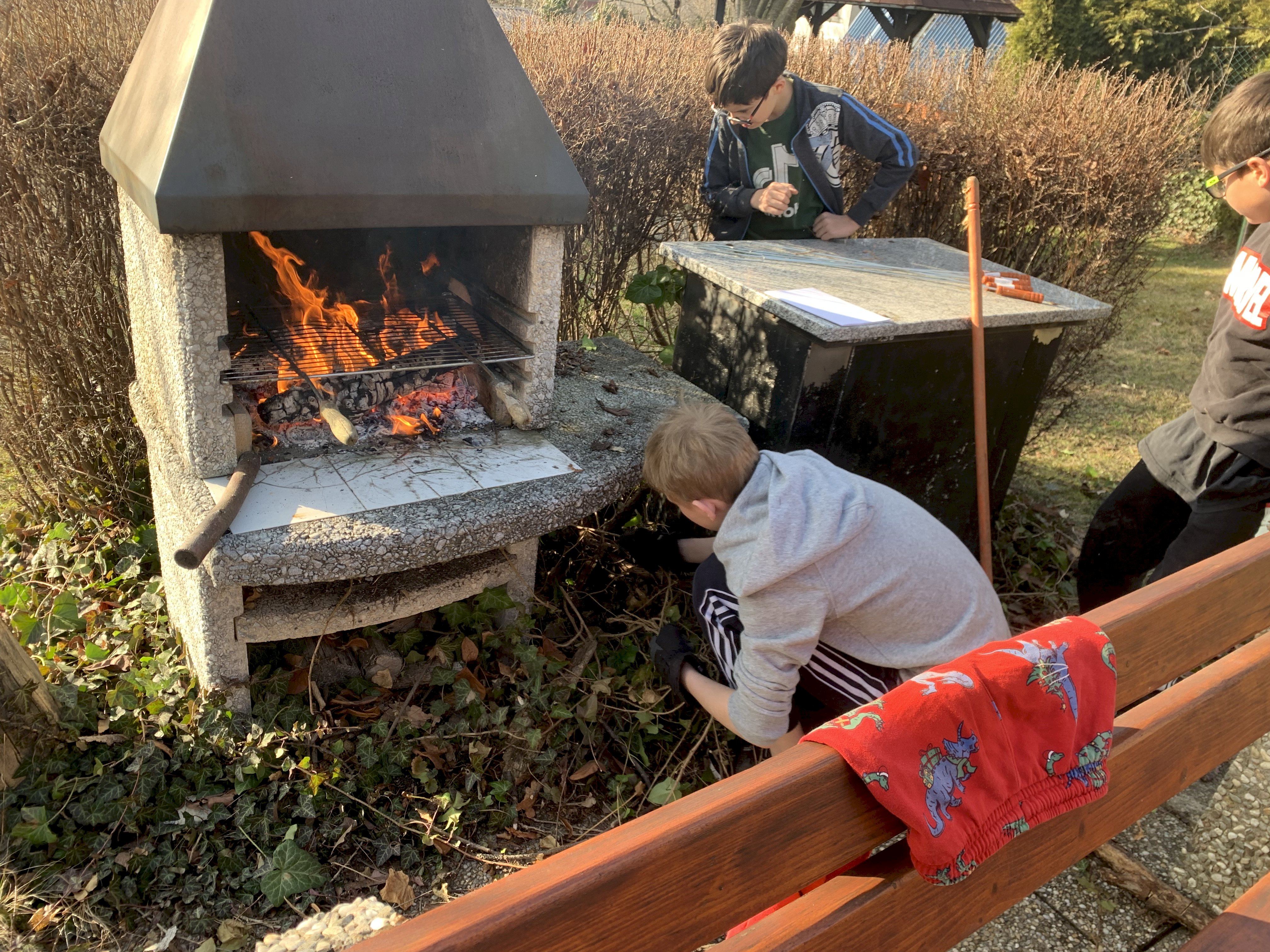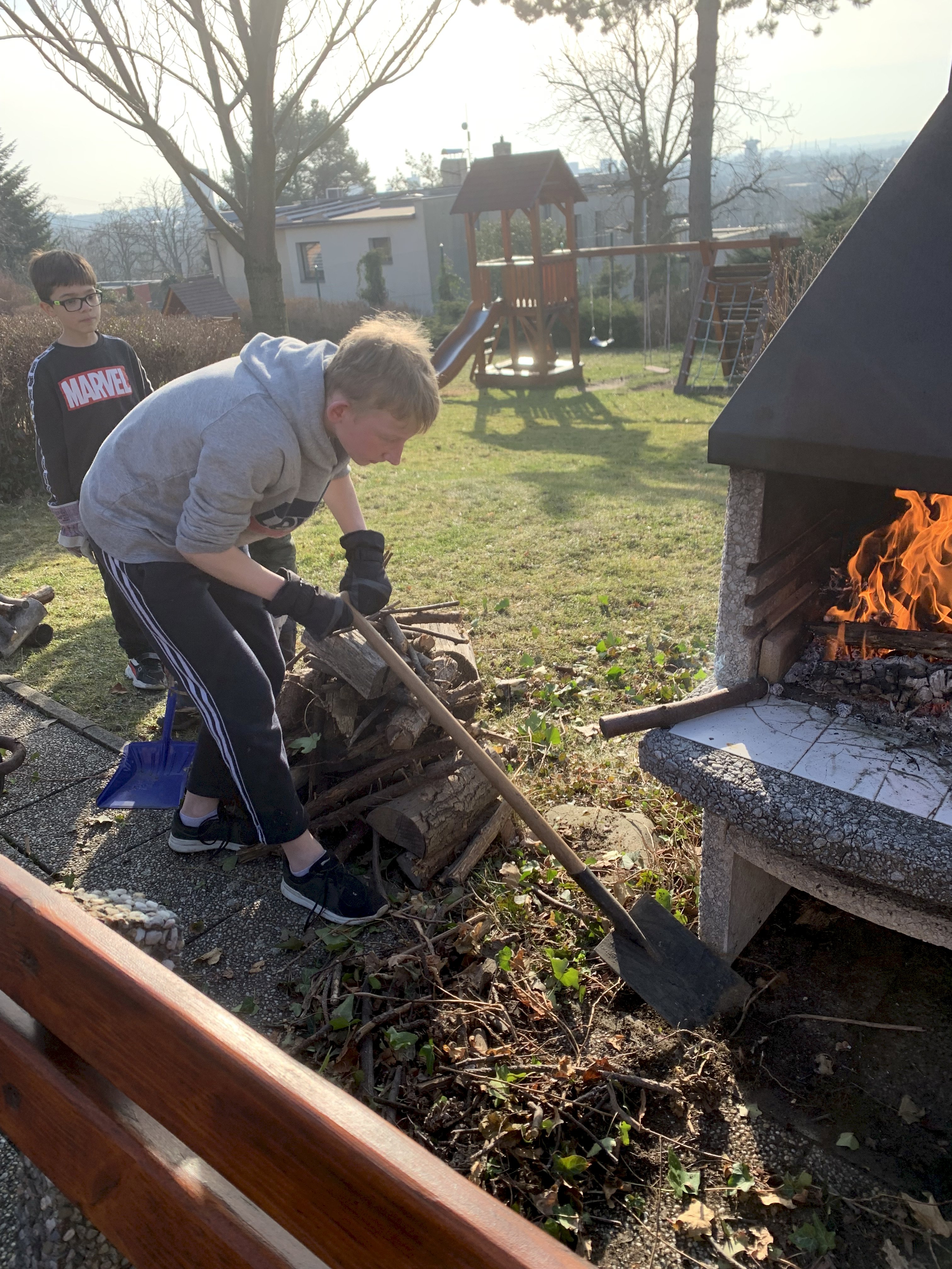 Neděli jsme pojali pracovně. Chtěli jsme di opéct buřty,ale bylo potřeba nejprve uklidit kolem krbu. Deti pracovali a pak si opekli každý svého špekáčka.